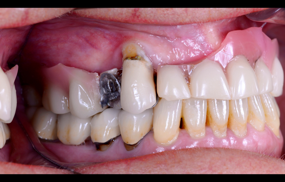 V prezentovaném případě byla k implantoprotetické rehabilitaci odeslána téměř 78letá pacientka, bývalá silná kuřačka. V průběhu let přišla v důsledku generalizované chronické parodontitidy o všechny zuby v horní čelisti, s výjimkou zubu 13, který byl výrazně kompromitovaný, viklavý a bez možnosti záchrany. Pacientka si stěžovala na přetrvávající krvácení, citlivou sliznici horní čelisti a halitózu. Její hlavní prioritou bylo mít „co nejdříve fixní zuby“, aby mohla konečně bez bolesti kousat a usmívat se.