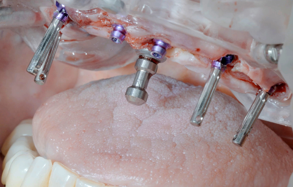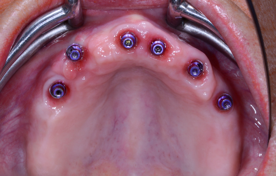 Bylo zavedeno šest implantátů copaSKY dle plánu – mírně palatinálně, aby se předešlo kontaktu s vestibulární kostní stěnou – v subkrestální poloze s primární stabilitou: v oblasti zubu 15: 3,5 × 10 mm, v oblasti 13: 4,0 × 14 mm, v oblastech 11, 21, 23: 3,5 × 12 mm a v oblasti 25: 4,0 × 10 mm.