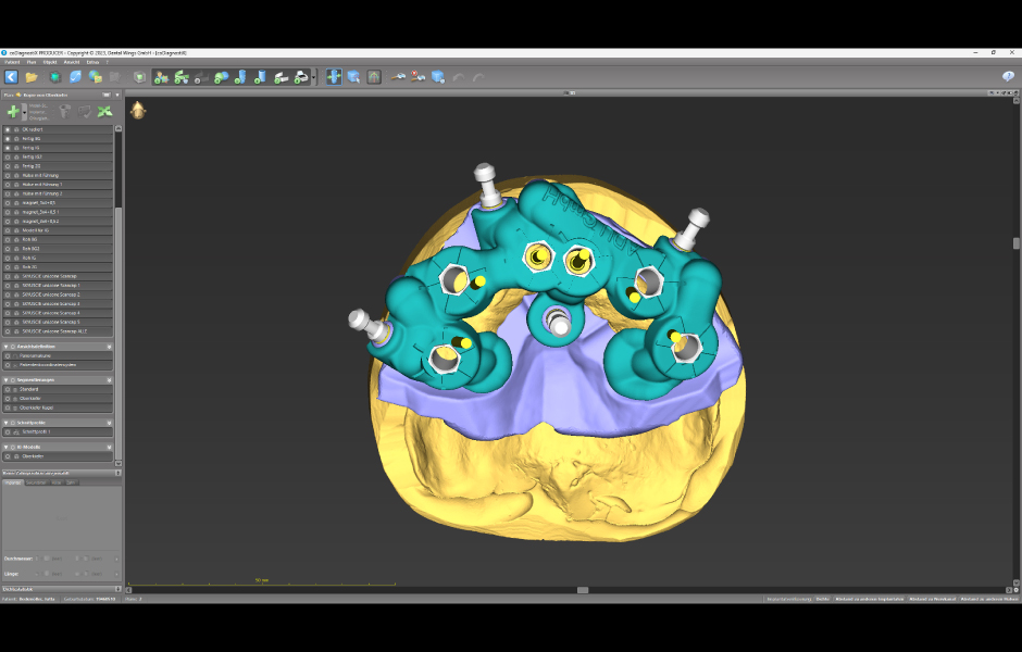 Na základě digitálně získaných informací – od CT vyšetření a registrace skusu až po STL soubor otisku – byla před chirurgickým výkonem navržena a vyrobena modulární chirurgická šablona (Co-DiagnostiX, Dental Wings) a současně i okamžitá provizorní rekonstrukce metodou CAD/CAM.