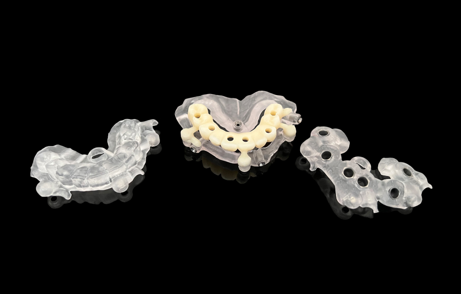 Abutmenty SKY uni.cone (bredent medical) byly zavedeny přímo skrze rozdělenou spodní část stohovatelné šablony v souladu s konceptem One-Time Therapy. Díky tvarově přesnému spojení jsou laterální síly z můstku přenášeny přímo na abutment, čímž se minimalizuje riziko povolení šroubů a fraktur.