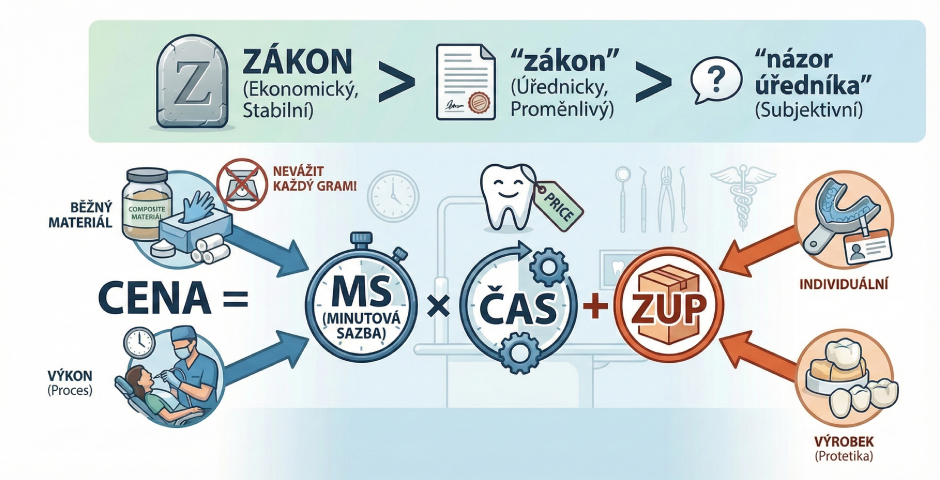 Tento požadavek je nejen právně nelegitimní, ale především jde ekonomickou zvrácenost: Žádný zákonný předpis, a to ani nejnovější Cenový předpis (CAU 2026), nepožaduje, aby stomatologové běhali po ordinacích s laboratorními váhami jako lékárníci v 19. století.