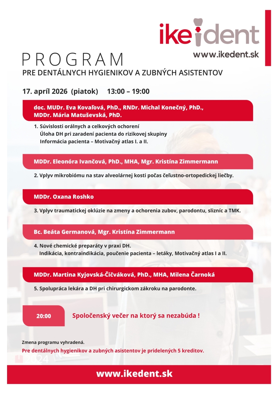 Pre ZL 10 kreditovPre DH a zubných asistentov 5 kreditovObčerstvenie a spoločenský večer