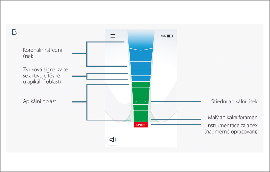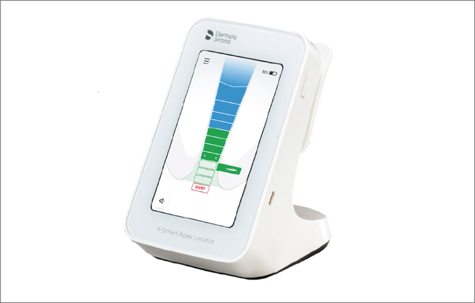 Přesná lokalizace apexu kořenového kanálku a správné určení pracovní délky jsou klíčovými faktory pro úspěšné endodontické ošetření. Evropská společnost endodontistů (ESE) a Americká asociace endodontistů (AAE) doporučují použití apexlokátoru v kombinaci s ověřovacími rentgenovými snímky [1, 2]. Zubní lékaři uvádějí, že toto moderní technologické zařízení používají v každodenní praxi již více než dvě desetiletí [3–5]. Moderní apexlokátory jsou cennými pomůckami nejen pro primární endodoncii, ale také jako užitečný nástroj při reendodontickém ošetření. Prokázaly také vysokou úspěšnost při určování perforací kořenů. Tyto přístroje poskytují přesné výsledky v různých podmínkách, například při přítomnosti krve, zubní dřeně nebo roztoku hypochloritu sodného v kořenovém kanálku, a to bez ohledu na velikost, slitinu či typ použitého endodontického nástroje [6–9].
