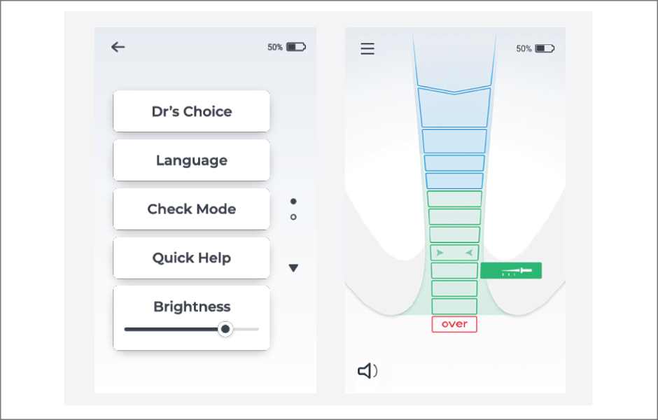 Volitelná funkce „Dr’s Choice“ je praktickou doplňkovou možností. Uživatel si může označit předem definovanou pozici uvnitř kořenového kanálku a získat dodatečnou vizuální i zvukovou signalizaci při dosažení této pozice hrotem endodontického nástroje (obr. 2).