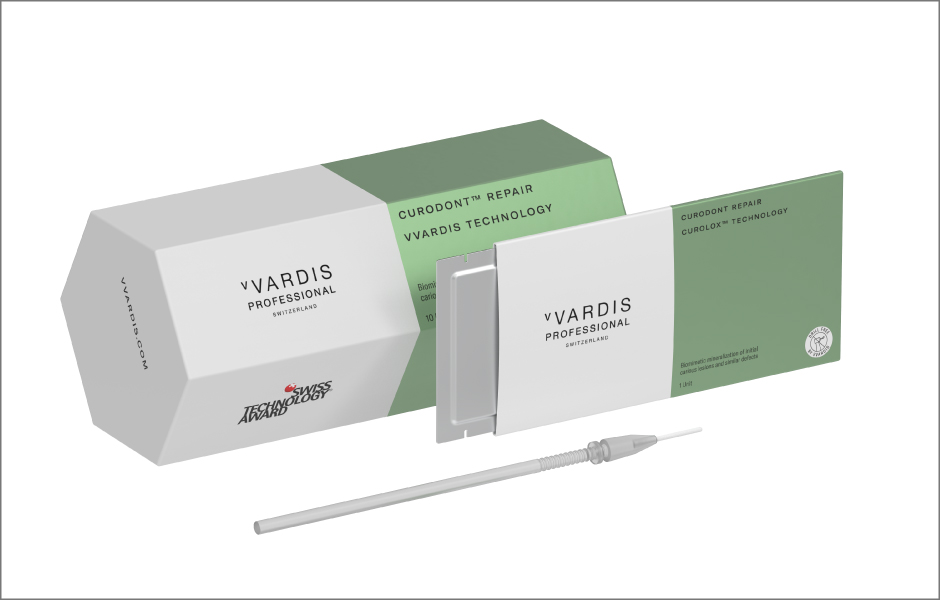 Curodont Repair od společnosti vVARDIS Switzerland představuje průlomovou léčebnou metodu, která využívá technologii samoorganizujících se peptidů k ošetření časných stadií zubního kazu prostřednictvím řízené regenerace skloviny. Přípravek využívá „inteligentní“ peptid, který vytváří biomimetickou trojrozměrnou matrici uvnitř subpovrchové počínající kariézní léze. Tato struktura následně přitahuje ionty vápníku a fosfátu ze slin, čímž umožňuje de novo formaci hydroxyapatitu a napodobuje tak přirozený proces biomineralizace.[5] Tato technologie je podložena více než 25 lety výzkumu, více než 200 publikacemi a více než deseti lety klinického používání.