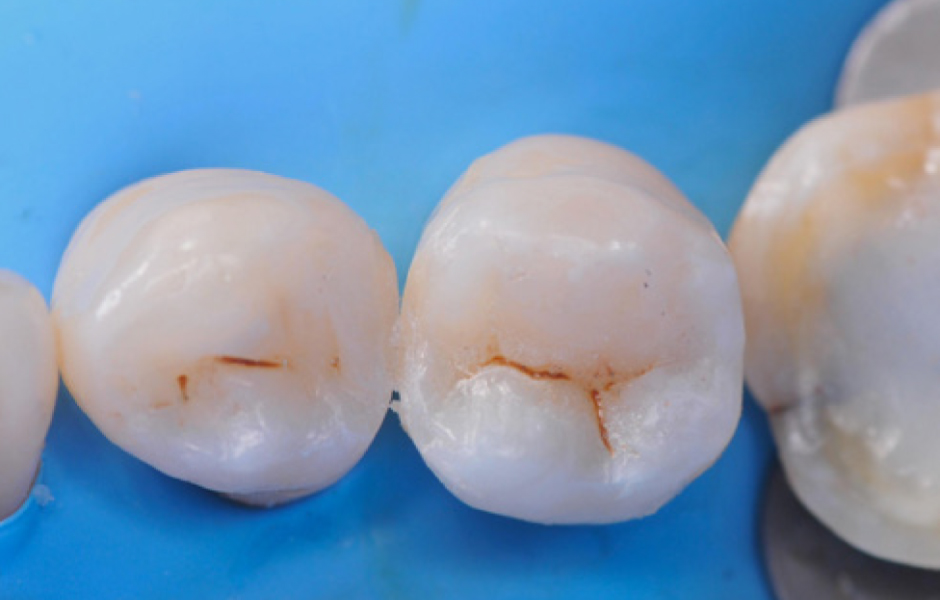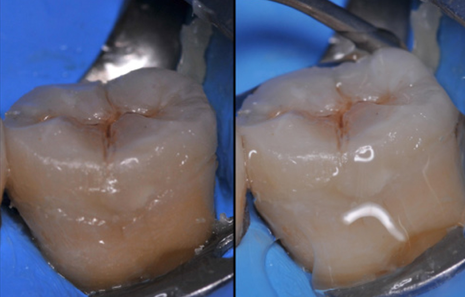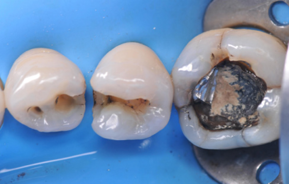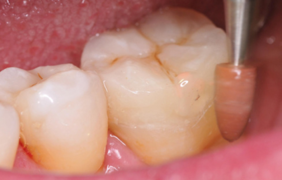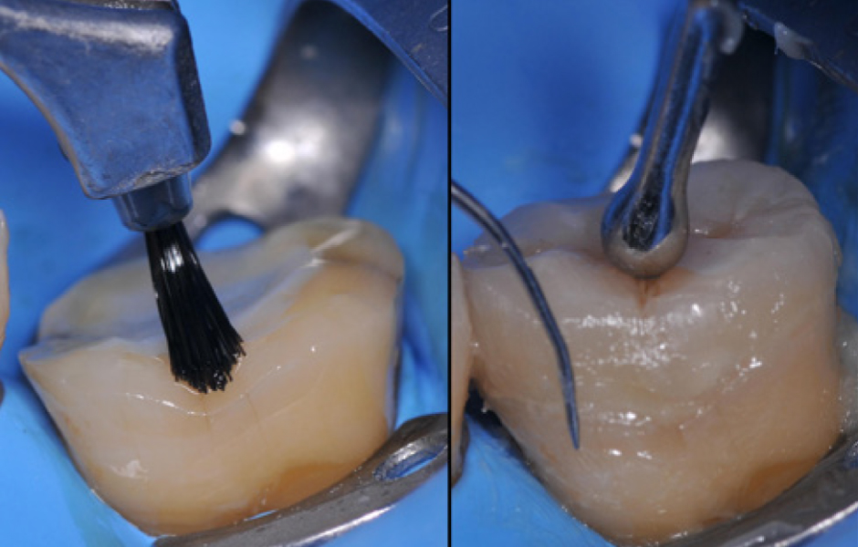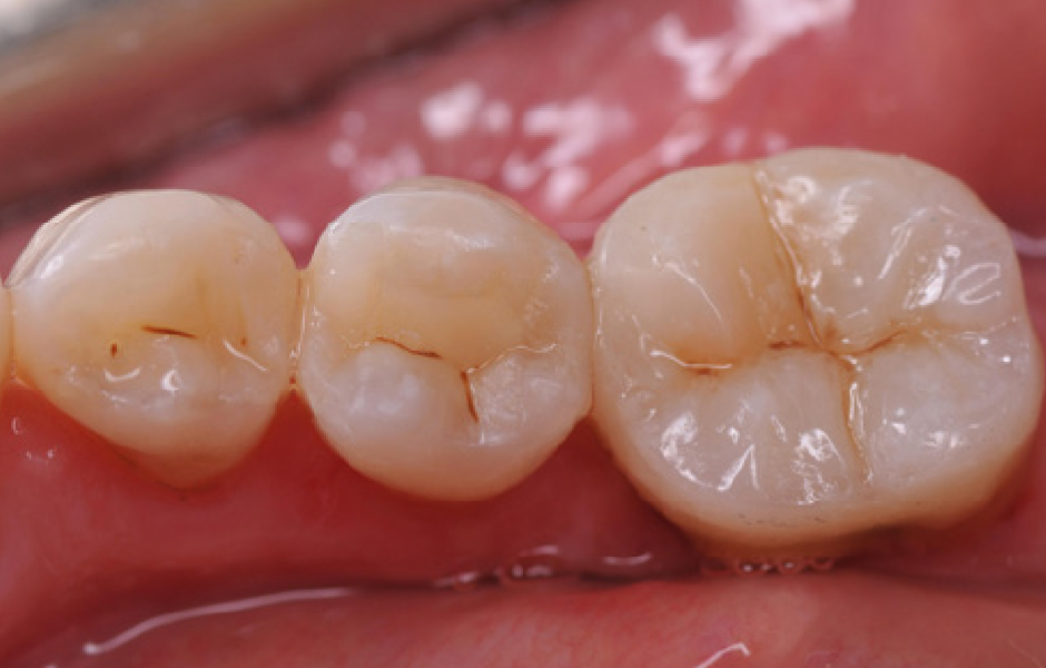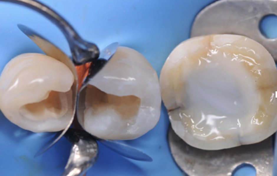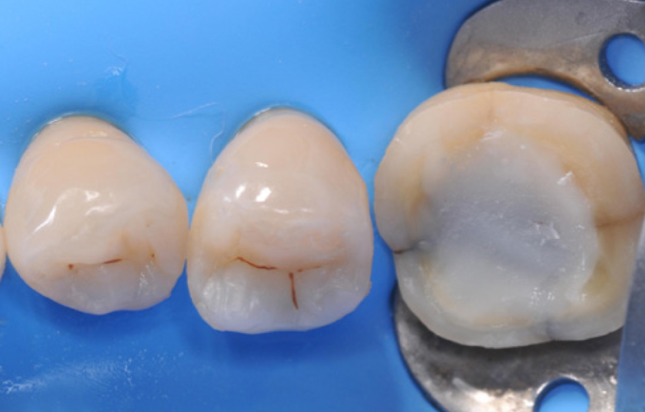 Obr. 4: Okamžité utěsnění dentinu. Obnažený dentin prvního moláru byl okamžitě ošetřen sealerem a byla provedena dostavba za použití SimpliShade Bulk Fill Flow (Kerr). Následně byly na premoláry umístěny dvě sekční matricové pásky pro postranní úsek, fixované oranžovým klínkem a kroužkem, pro zhotovení výplní II. třídy.