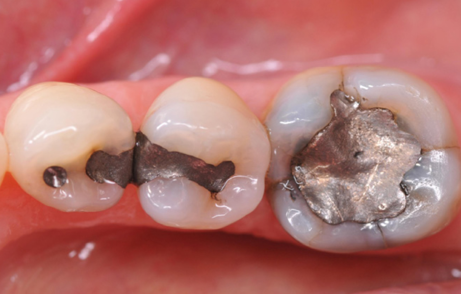 Obr. 1: Výchozí situace. Výchozí situace se týká staršího pacienta se starými amalgámovými výplněmi v pravém dolním distálním úseku, které si pacient přál odstranit z estetických důvodů.
