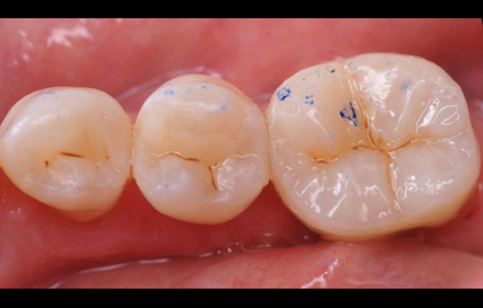 Obr. 5: Přímé výplně. Za dodržení zásad adhezivního postupu byly dokončeny přímé výplně na premolárech s použitím jednoho odstínu SimpliShade Bulk Fill (Kerr) a následně provedena individualizace okluze hnědými pigmenty. Díky snadné manipulaci a nízkému polymeračnímu smrštění bylo možné vyplnit obě kavity jedinou 4mm vrstvou kompozitu. Materiál byl přizpůsoben kavitě a modelován pomocí techniky Espresso posterior lines, což ušetřilo cenný čas.