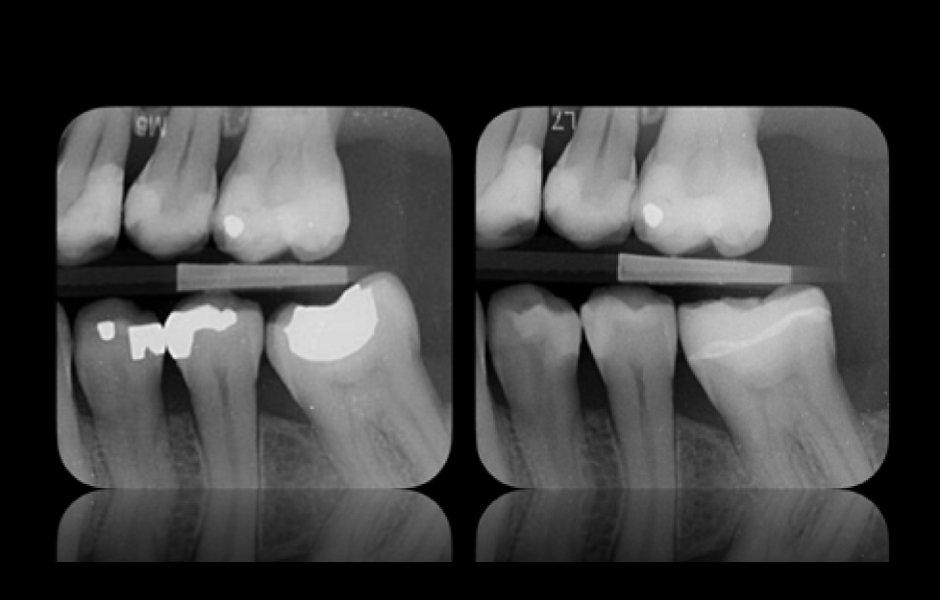 Obr. 12: Radiologické vyšetření. Radiologické snímky (vlevo před a vpravo po) ukazují přesné dosednutí nepřímé rekonstrukce s úplným utěsněním všech marginálních oblastí pryskyřičným cementem, bez přítomnosti přebytků.