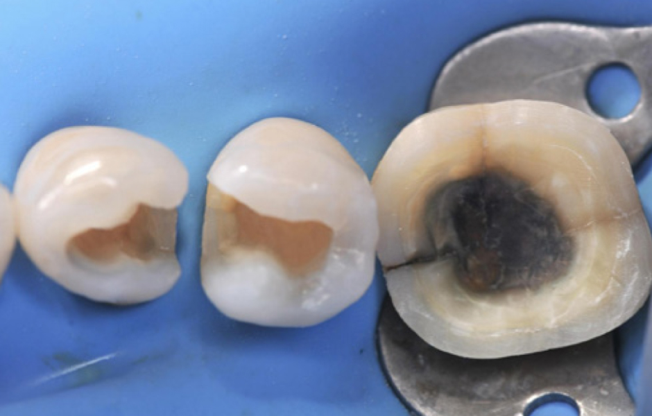 Obr. 3: Preparace kavit. Konečný stav preparací kavit: Byly dokončeny dvě kavity II. třídy a u prvního moláru byla provedena preparace pro overlay. Infrakce na meziální stěně moláru zůstala nedotčena; aby se zabránilo její další propagaci. Bude zpevněna při cementaci nepřímé rekonstrukce.