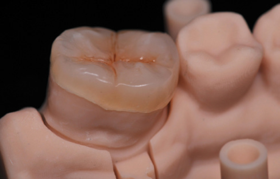 Obr. 6: Nepřímé rekonstrukce. Po dokončení výplní byly digitálně sejmuty otisky pomocí intraorálního skeneru Helios 500 (Eighteeth). Výhodou digitálního postupu je, že umožňuje dokončit rekonstrukci během jednoho dne. Finální nepřímá rekonstrukce byla totiž připravena k cementaci již o hodinu později.