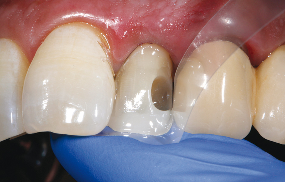 Povrchová sklovina na labiální ploše zubu byla šetrně upravena diamantem s jemnou zrnitostí a v oblasti krčku byl vytvořen jemný paragingivální schůdek, který zajistí plynulý přechod mezi přímou kompozitní fazetou a přirozeným obrysem zubu v této oblasti. Současně byla odstraněna původní nevyhovující distolabiální kompozitní výplň (obr. 4). Pro odhalení preparačního okraje v oblasti krčku bylo zavedeno retrakční vlákno, což vedlo ke krvácení (obr. 5). Proto byla do sulku aplikována retrakční pasta s adstringentním účinkem (Retraction Paste, VOCO GmbH, Cuxhaven) přímo z kapsle pomocí velmi tenké kónické kanyly (obr. 6). Po dvouminutovém působení byla pasta důkladně, ale velmi opatrně odstraněna vodním sprejem za současného použití výkonného odsávání (obr. 7). Ošetřovaná oblast byla poté vysušena vzduchem. Lokální krvácení v oblasti dásně bylo účinně a spolehlivě zastaveno právě použitím retrakční pasty obsahující chlorid hlinitý a kaolin (obr. 8). Pouze čisté a suché pracovní pole umožňuje v dalším průběhu zákroku pracovat bez kontaminace. V následujícím kroku byly oba sousední zuby chráněny teflonovou páskou (obr. 9).