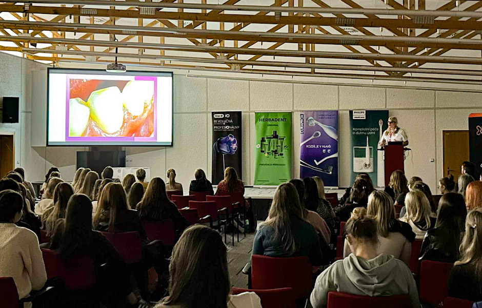 Asociace dentálních hygienistek ČR má svou sekci přednášek, které se konají v konferenčním centru u vstupní haly II. Na přiložené fotografii vidíte přednášku Odhalený biofilm - barvení jako nástroj motivace pacienta, kterou vedla Mgr. Bc. Markéta Marušanová, DiS.