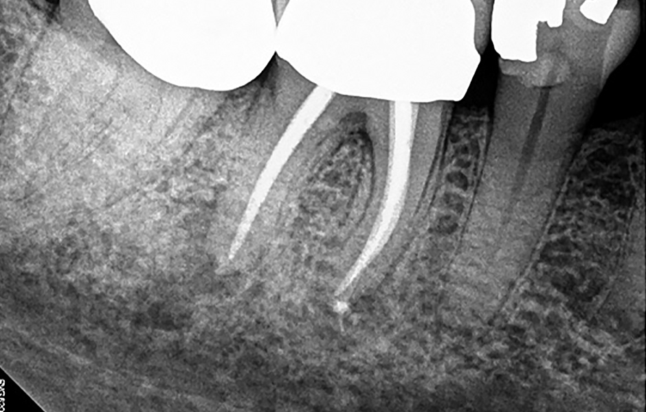 Byl pořízen pooperační periapikální rentgenový snímek (obr. 3) a pacientce byly poskytnuty instrukce pro domácí péči. Následující den byla pacientka telefonicky kontaktována, zda nemá nějaké otázky či obavy. Uvedla, že se cítí dobře, ale pociťuje mírnou citlivost a jednou užila ibuprofen.