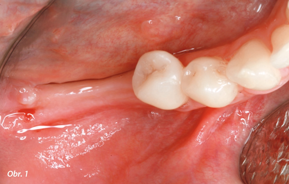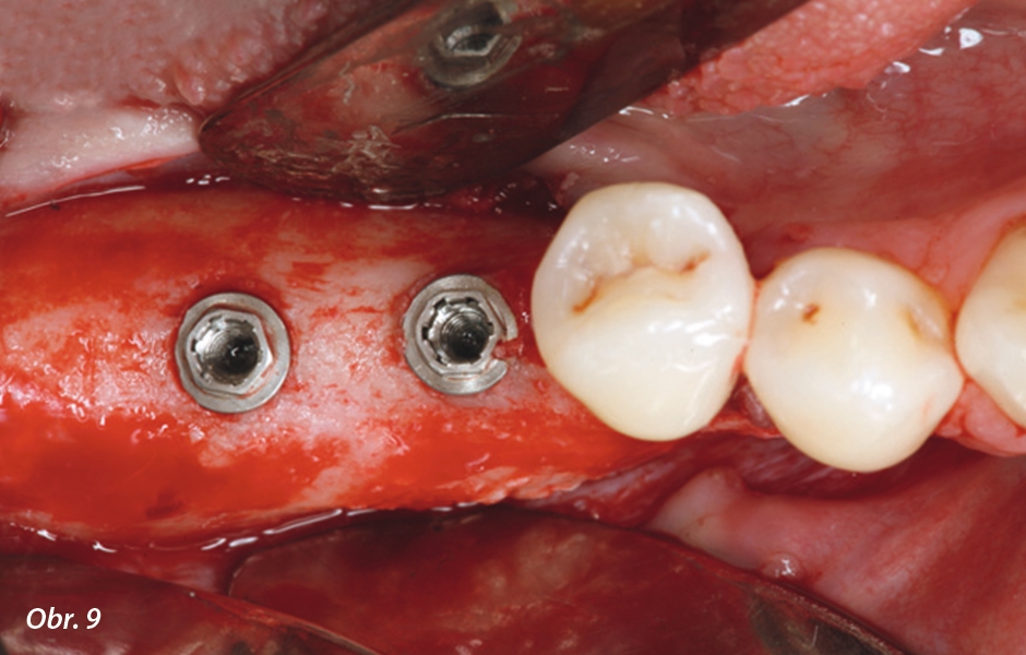 Bukální pohled na jednu membránu Geistlich Bio-Gide fixovanou titanovými piny. Piny mají průměr 1 mm a jsou v kortikální kosti dolní čelisti stabilní.