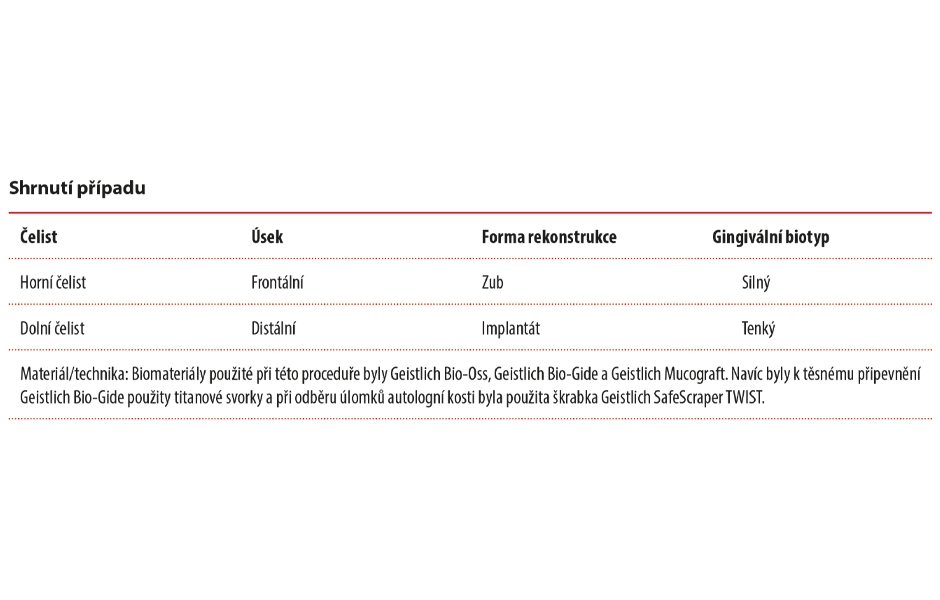 - Materiál Geistlich Mucograft s páskem keratinizované tkáně byl použit ke zvětšení vestibulární hloubky a získání dalších keratinizovaných tkání