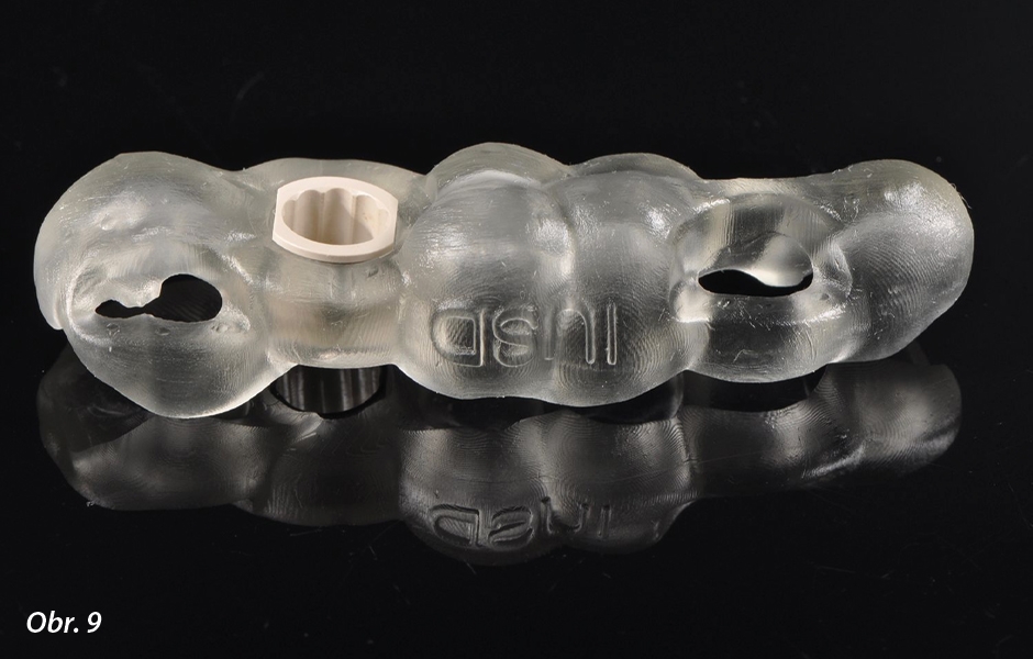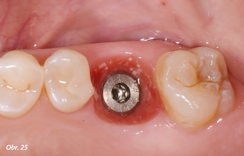 Po zavedení implantátu byl na implantát točivým momentem 15 Ncm připevněn provizorní abutment (Temporary Abutment Crown; Institut Straumann AG). Provizorní korunka vytištěná na 3D tiskárně byla upravena tak, aby plně dosedala na provizorní abutment. K upevnění provizorní korunky na provizorním abutmentu byla použita samovolně polymerující pryskyřice. Poté byla provizorní korunka z implantátu sejmuta a následně upravena a vyleštěna v zubní laboratoři. K ochraně provizorní korunky byla použita vrstva světlem polymerující pryskyřice (obr. 20–24).