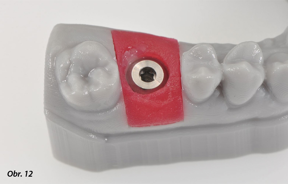Po dokončení operačního plánu byl soubor importován do programu softwaru počítačem řízeného navrhování a výroby, tedy CAD/CAM (CARES® Visual; Institut Straumann AG), kde byla navržena provizorní náhrada s prefabrikovaným přístupem ke šroubku implantátu. Provizorní náhrada byla vytištěna na 3D tiskárně z keramického materiálu s hybridními plnivy (obr. 10–13).