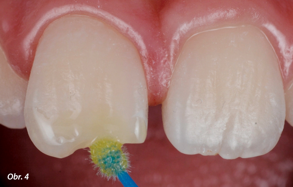 Po pečlivém očištění extratenkým tvarovacím a lešticím diskem 3M™ Sof-Lex™ (hrubá zrnitost) byl zub naleptán po dobu 15 sekund univerzálním leptadlem 3M™ Scotchbond™ Universal Etchant a oplachován po dobu 20 sekund