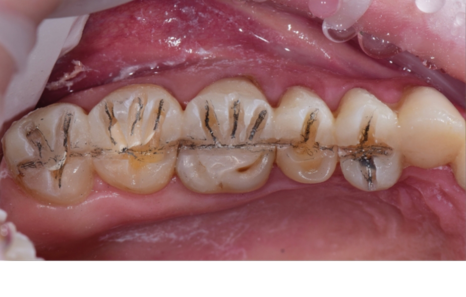 Poté, co jsem zhotovil výplně zubů, přistoupil jsem k závěrečné preparaci pro overlaye. Správně naplánovaná preparace mi umožnila docílit optimálního prostoru pro umístění provizorní náhrady v podobně 5 spojených členů, kterou jsem zhotovil nepřímo a nacementoval provizorním cementem (v tomto případě jsem použil karboxylový cement).
