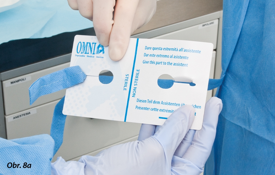 Jakmile jsou sterilní rukavice navléknuté, zapne se plášť. Instrumentářka odstraní upevňovací šňůry pásu (popruhu) z jejich držáku.