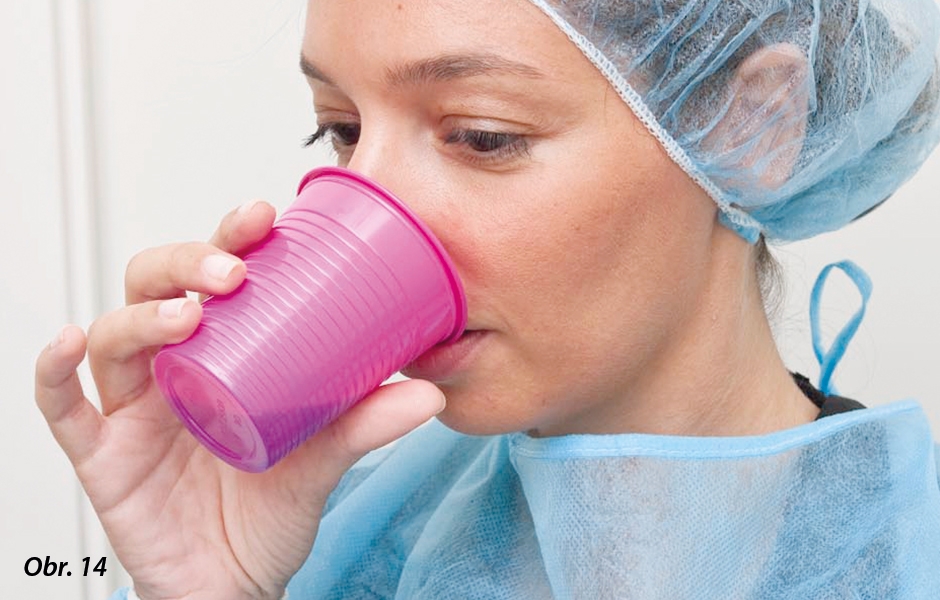 Pacient si vypláchne ústa 0,2% roztokem chlorhexidinu po dobu 1 minuty, aby se snížila bakteriální koncentrace,5, 6 a je odveden na operační sál (obr. 14). Poté se zavede intravenózní katetr pro připojení infuze a pro případné nouzové podávání léků, a poté jsou zapojena monitorovací zařízení pro monitorování životně důležitých parametrů během operace. Instrumentářka se postará o asepsi periorální pokožky tak, že otře oblast antiseptickým roztokem jodového povidonu, kdy začíná od rtů a pohybuje se nahoru k nosu a následně dolů k bradě krouživými pohyby (obr. 15a).9, 10 Po provedené dezinfekci pokožky jsou umístěny sterilní lepicí roušky tak, aby jimi byla ohraničena očištěná oblast (obr. 16a).