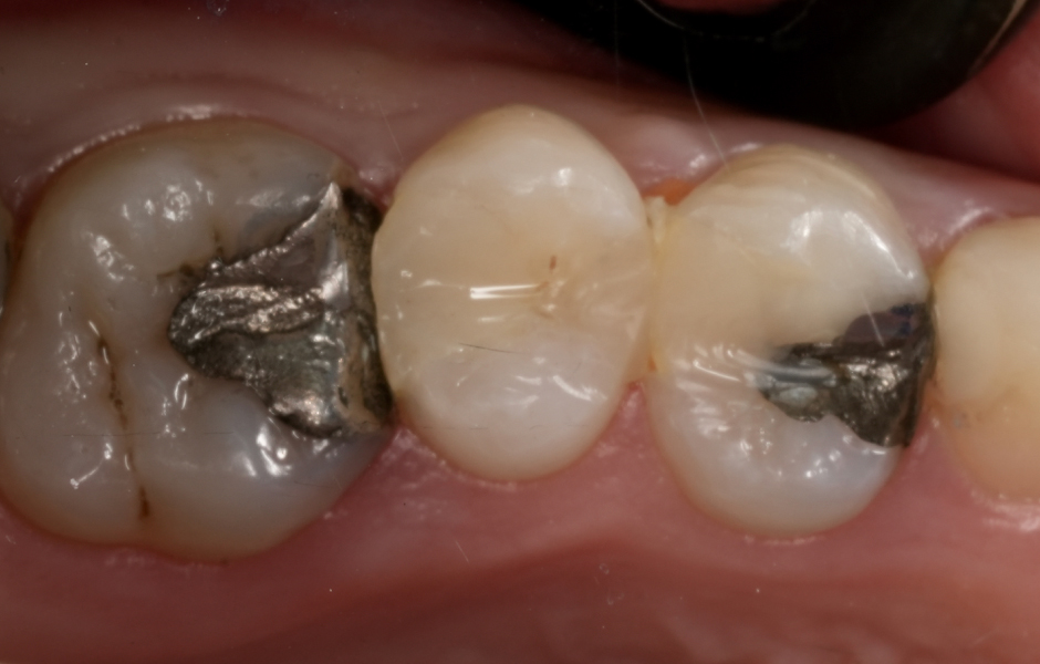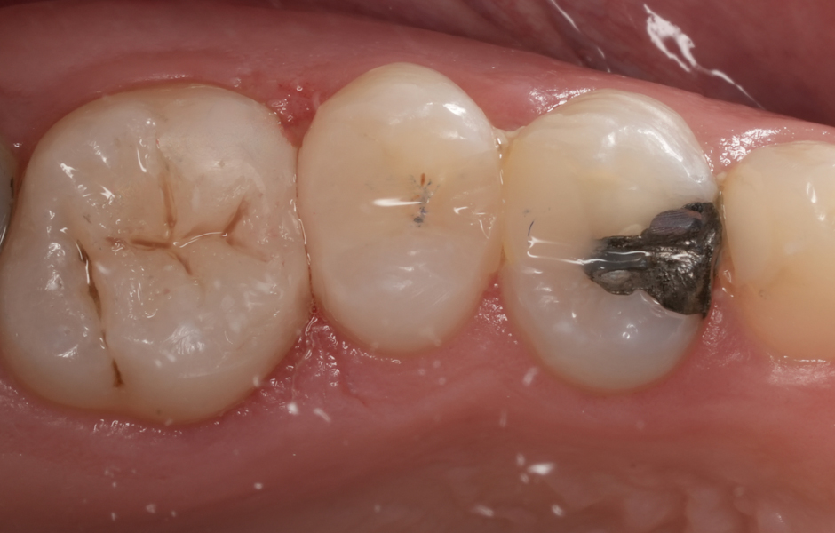 Obr. 2a: Nevyhovující amalgámová výplň na zubu 16 s klinickými známkami možného sekundárního kazu.