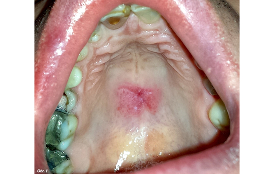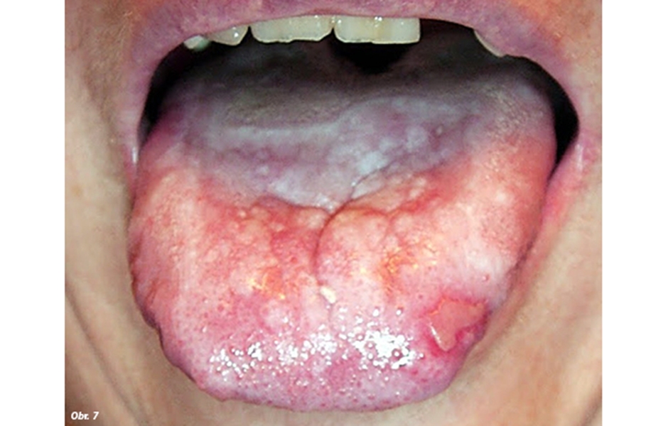 Obr. 7: Plak forma lichen planus na tele jazyka a erozívna forma na povrchu prednej tretiny
