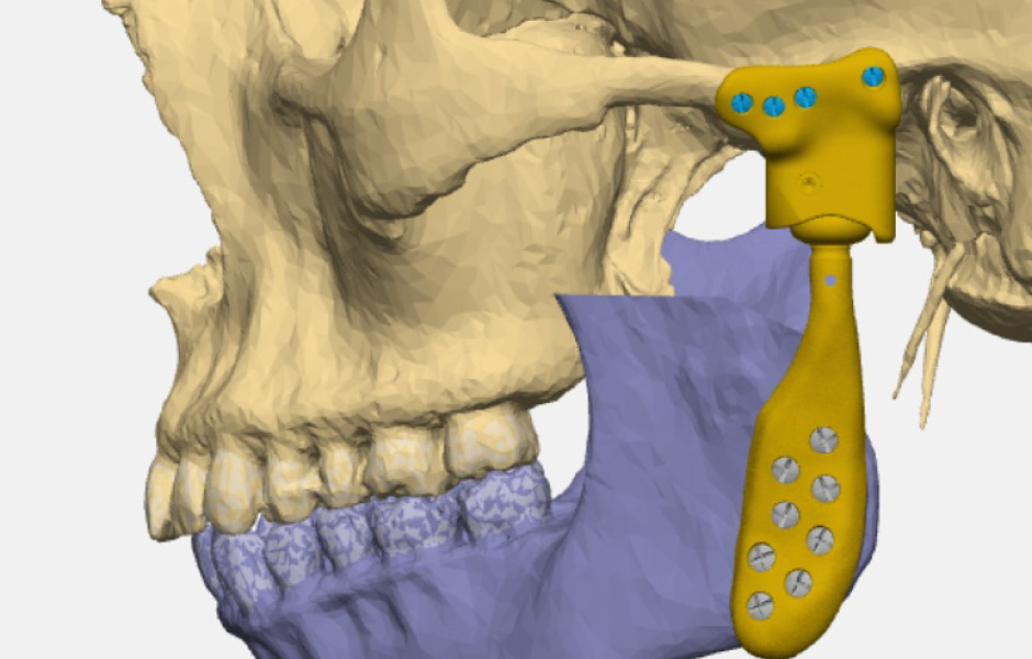 Obr. 11: Virtuální plánování totální náhrady – osteoartróza TMK vlevo.