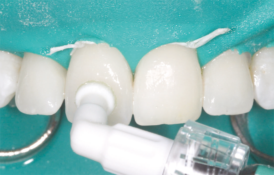 Tento postup byl u nejhlubších lézí opakován čtyřikrát, aby bylo dosaženo požadované hloubky pro plnou infiltraci léze. Účinek postupu byl testován pomocí Icon Dry (100% etanol) po dobu 30 sekund (obr. 5). Po čtyřech opakováních byly dokonce i nejhlubší léze v optické harmonii s okolní sklovinou a skvrny zmizely.