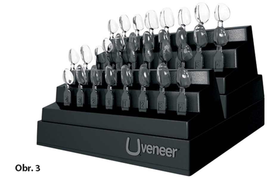 Obr. 3: Pohled na kompletní sadu Uveneer (Dental Art Innovations) obsahující šablony ve dvou velikostech k dosažení estetického výsledku u většiny zubů