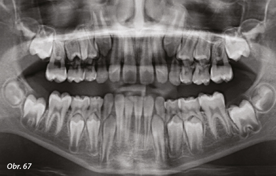 Obr. 66: Úvodní ortopantomogram: stěsnání horního zubního oblouku se zmenšením prostoru pro správné prořezání horních stálých řezáků.