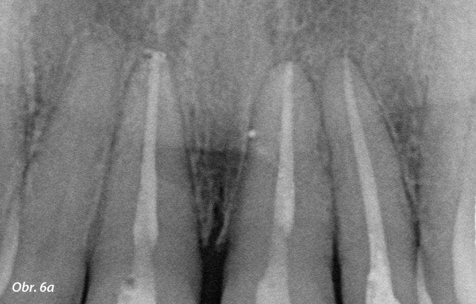 Klinická výchozí situace. Endodonticky ošetřené zuby 11–22 po úrazu. Proteticky mají být ošetřeny zuby 12–22 (zdroj: zubní lékařka Swantje Matthes).