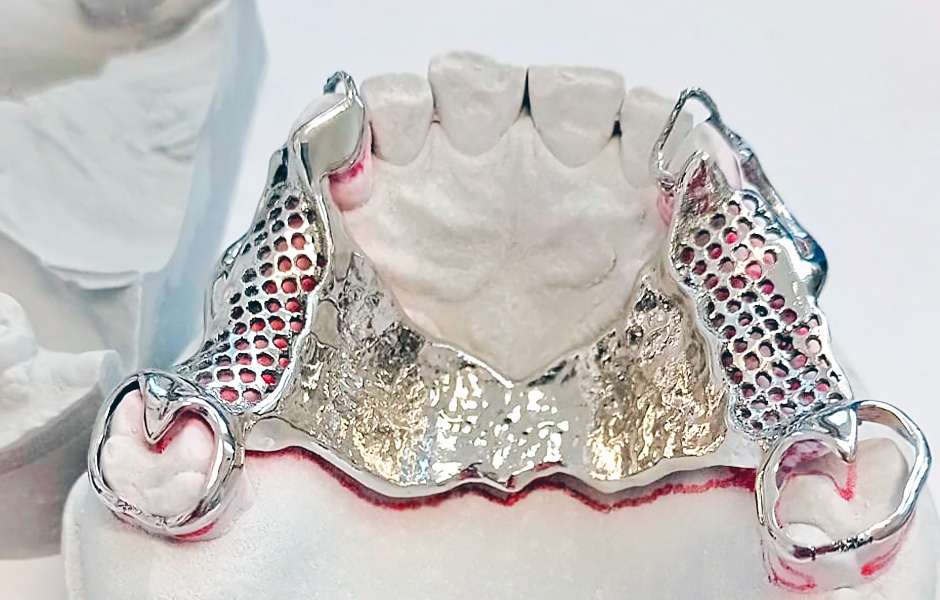 Obr. 5a: 3D tištěný skelet z CrCo se supporty na sponách po dodání z výroby centra SINTEO.