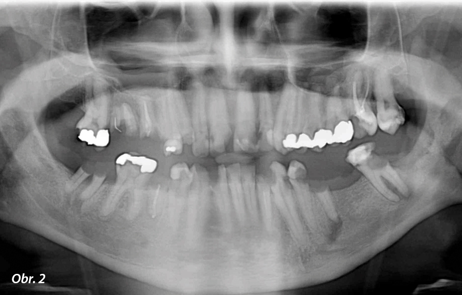 V první fázi ošetření zavedl zubní lékař implantáty do oblastí zubů 12-22-14-16-24-26 a 32-42-35-45. Na konci chirurgické fáze bylo v ústech pacienta zavedeno celkem 10 implantátů: 6 v horní čelisti a 4 v dolní čelisti (obr. 3, 4). Poté byl pořízen otisk situace a odeslán nám do laboratoře (zubní laboratoř Art in Dent ve spolupráci s firmou Zirkonzahn).
