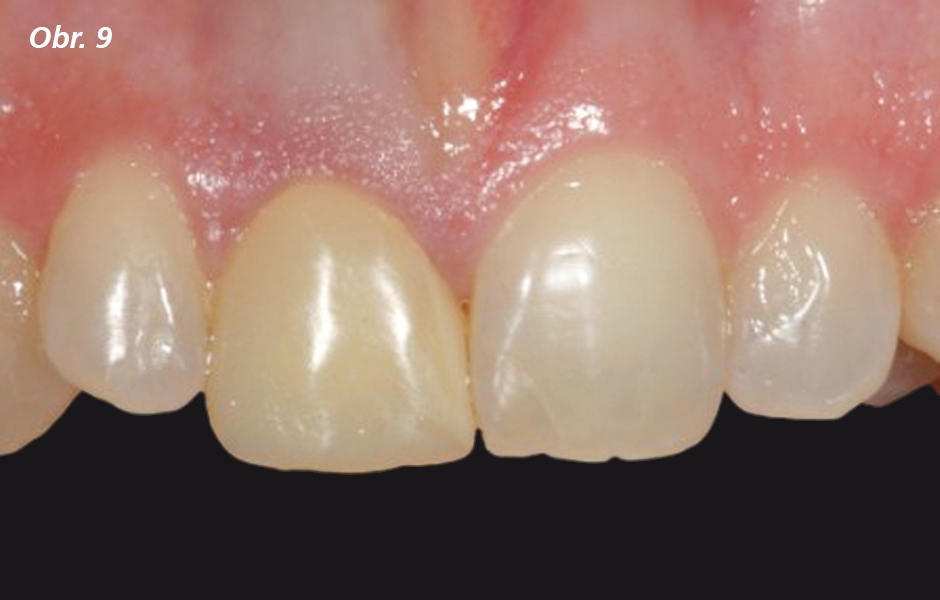 Souběžně s gingivektomií byla odstraněna metalokeramická korunka (obr. 6) a horní řezák byl na pravé straně rekonstruován pomocí čepu vyztuženého skleněným vláknem (obr. 7) bez provedení opakovaného endodontického ošetření, následně preparován (obr. 8) a nakonec opatřen provizorní terapeutickou náhradou (obr. 9), která zajistila hojení gingiválních tkání v odpovídající pozici. Po 6 týdnech Francesco provedl preparaci pro definitivní protetickou náhradu.