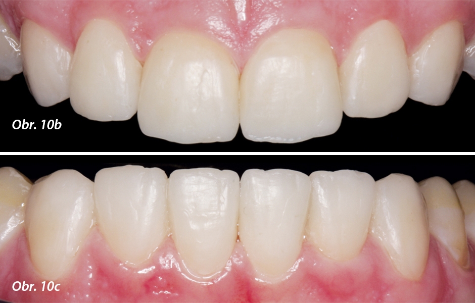 V laboratoři zhotovené korunky jsou připraveny ke zkoušce již s doplněnými charakteristikami. Nyní můžeme ještě jednou zkontrolovat estetiku, fonetiku a funkci a fotograficky zdokumentovat situaci. Po případných nezbytných úpravách probíhá glazovací pálení. Tloušťka stěny rekonstrukcí (360° fazety/částečné korunky) se pohybuje mezi 0,3 a 0,5 mm (obr. 11).