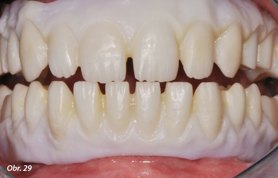 Níže prezentované náhrady byly vyrobeny z vysoce translucentního zirkonu. Tento materiál umožňuje vytvořit ve srovnání s dřívějšími materiály naprosto odlišné konstrukce. Vysoká relevantní translucence má pozitivní vliv na prostupnost světla, díky čemuž je objem konstrukce můstku větší a napomáhá tak k ochraně fazet z keramiky před okluzní zátěží a brusnými silami, především v distálních oblastech.