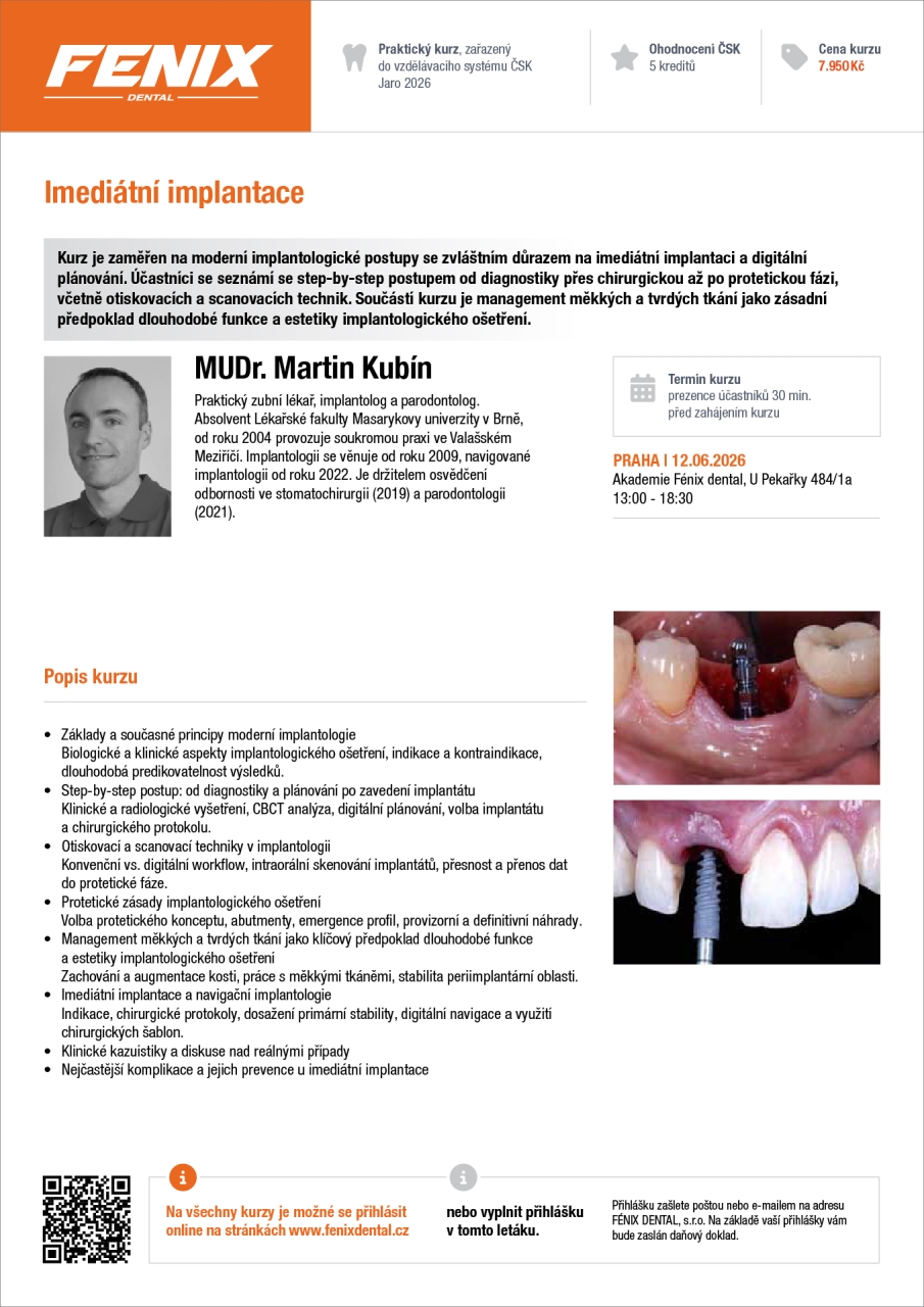 Pá 12. 6. 2026 | 13.00 – 18.00 hod. | Akademie Fénix Dental, U Pekařky 484/1a, PrahaMUDr. Martin Kubín
