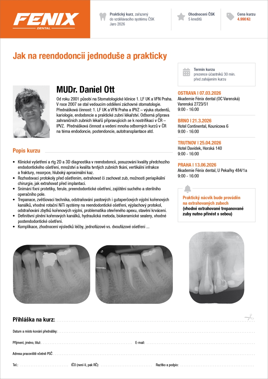 • Trepanace, zvětšovací technika, odstraňování pastových i gutaperčových výplní kořenových kanálků, vhodné rotační NiTi systémy na reendodontické ošetření, výplachový protokol, odstraňování zbytků kořenových výplní, problematika otevřeného apexu, stavění krvácení.