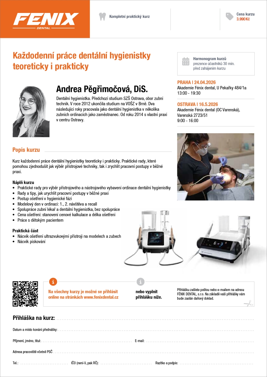 Kurz každodenní práce dentální hygienistky teoreticky i prakticky. Praktické rady, které pomohou zjednodušit jak výběr přístrojové techniky, tak i zrychlit pracovní postupy v běžné praxi.