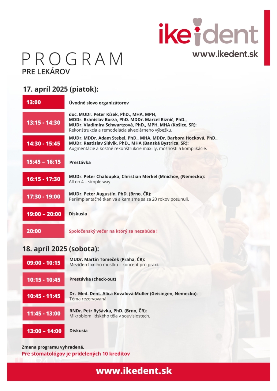 Pre ZL 10 kreditovPre DH a zubných asistentov 5 kreditovObčerstvenie a spoločenský večer