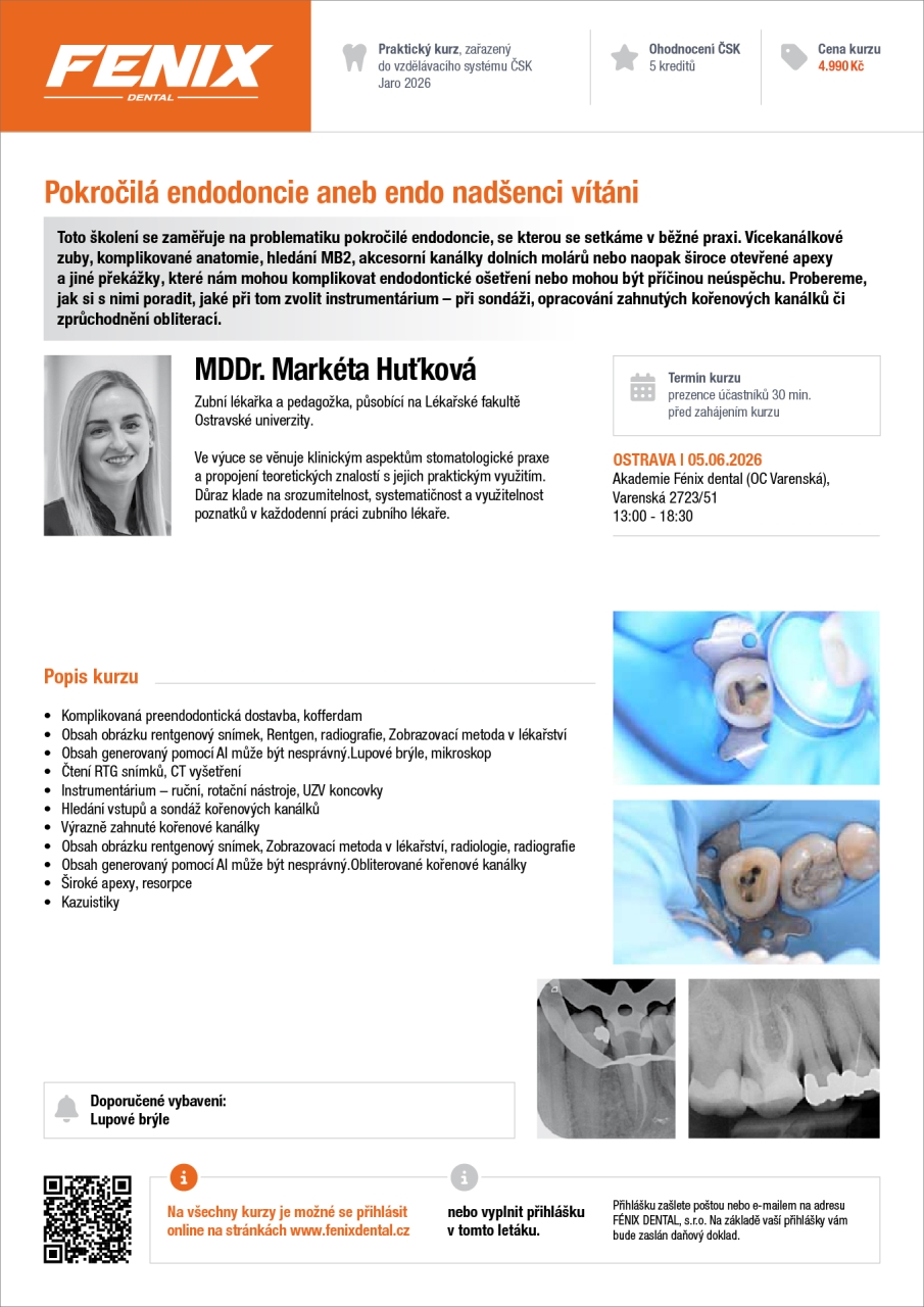 Toto školení se zaměřuje na problematiku pokročilé endodoncie, se kterou se setkáme v běžné praxi. Vícekanálkové zuby, komplikované anatomie, hledání MB2, akcesorní kanálky dolních molárů nebo naopak široce otevřené apexy a jiné překážky, které nám mohou komplikovat endodontické ošetření nebo mohou být příčinou neúspěchu. Probereme, jak si s nimi poradit, jaké při tom zvolit instrumentárium – při sondáži, opracování zahnutých kořenových kanálků či zprůchodnění obliterací.