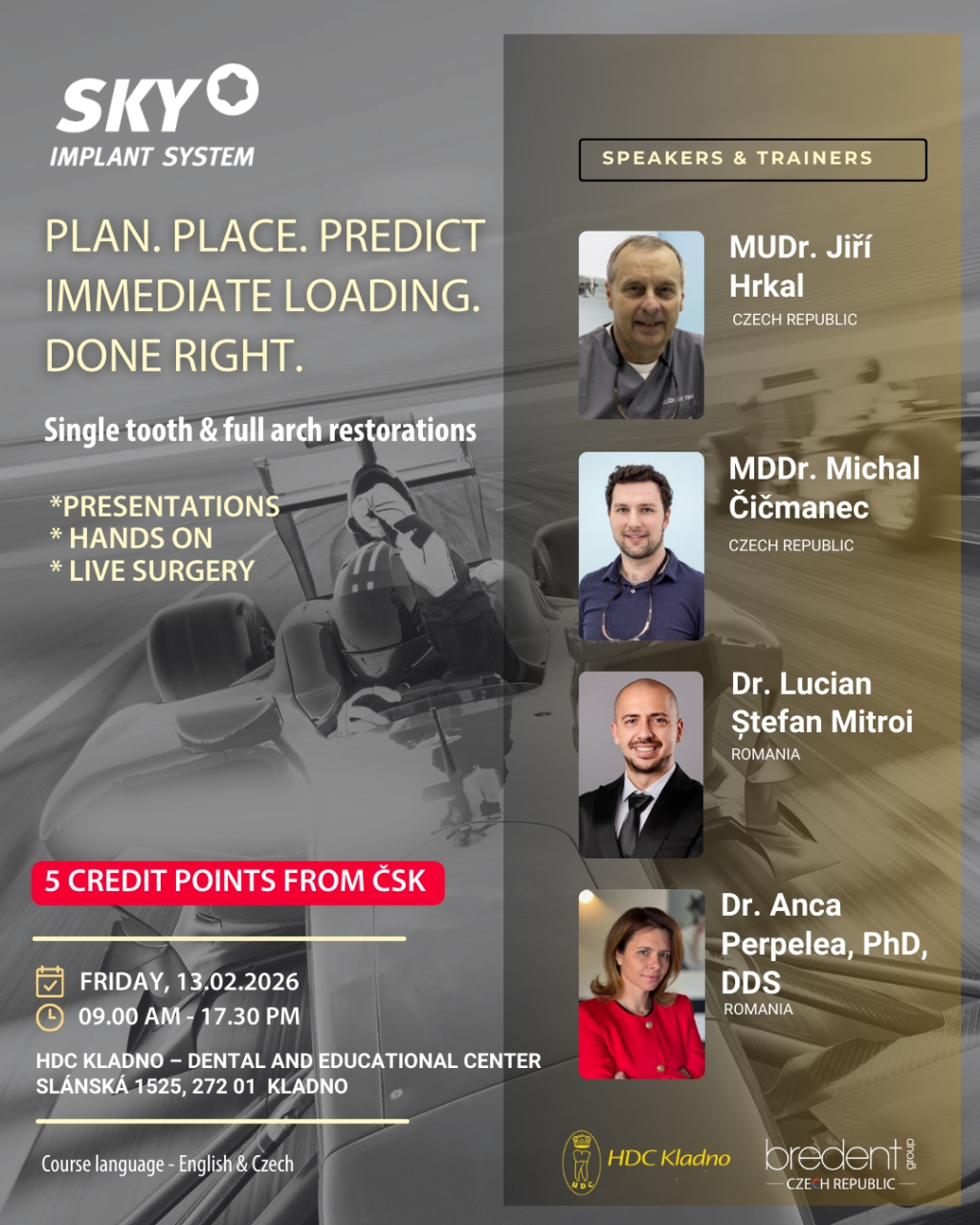 Pá 13. 2. 2026 | 8:30 – 17.30 hod. | KladnoDr. Lucian Mitroi (Rumunsko), Dr. Anca Perpelea (Rumunsko), MUDr. Jiří Hrkal – HDC Kladno, MDDr. Michal Čičmanec – HDC Kladno