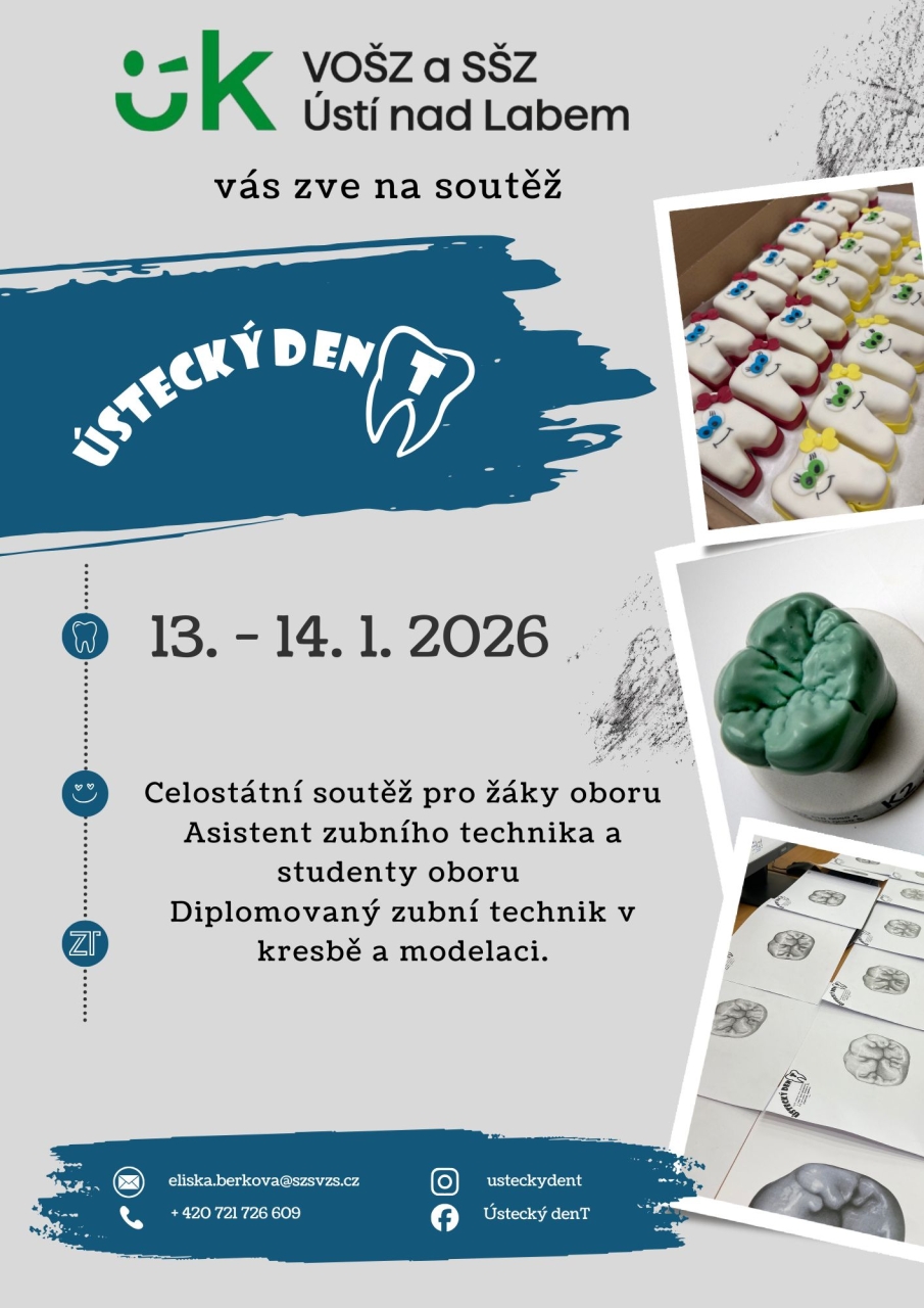 dovolte mi , abych Vás jménem naší Vyšší odborné školy zdravotnické a Střední školy zdravotnické v Ústí nad Labem srdečně pozvala na další ročník mezinárodní soutěže zubních techniků Ústecký denT, který se uskuteční ve dnech 13. - 14. ledna 2026 v prostorách naší školy (Palachova 35, Ústí nad Labem).